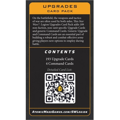 Na polu walki zarówno broń, jak i taktyki są ciągle udoskonalane przez obie strony konfliktu.   Upgrades Card Pack to idealne rozszerzenie dla graczy Star Wars: Legion, które wprowadza 191 zaktualizowanych kart ulepszeń. Każda z nich jest uniwersalna - nie jest przypisana do konkretnych frakcji ani jednostek, co oferuje jeszcze większą elastyczność w budowaniu armii i planowaniu bitew.   W zestawie znajdziesz karty: Command, Training, Gear, Comms, Programming, Generator, Force oraz Grenade.   Kluczowe cechy: Wszystkie karty w zestawie zostały zaktualizowane zgodnie z najnowszymi zasadami Star Wars: Legion. To idealne rozwiązanie dla początkujących graczy, którzy szukają większej różnorodności podczas budowy armii. Świetna opcja dla doświadczonych dowódców, którzy chcą uaktualnić swoją kolekcję. Karty zawarte w tym zestawie są uniwersalne i mogą być używane w każdej frakcji oraz z każdą jednostką.