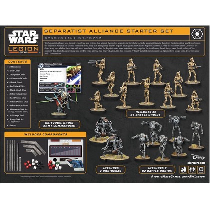 Separatist Alliance Starter Set zawiera 600 punktową armię na poziomie Recon oraz wszystkie kości, szablony, narzędzia i żetony potrzebne do rozpoczęcia gry. Jest to idealny zestaw dla nowych graczy, którzy chcą rozpocząć swoją przygodę ze Star Wars: Legion, a także dla tych, którzy planują rozwijać swoje siły i rozgrywać większe bitwy.   Armia o wartości 600 punktów na poziomie Recon odnosi się do standardowej siły przeznaczonej do małych potyczek, będącej najmniejszą oficjalnie rozgrywaną formą gry. Armie tego typu budowane są zgodnie z zasadami Recon, które określają rodzaje jednostek oraz limity punktowe. Każda frakcja - Rebelia, Imperium, Republika, Separatyści i inne - oferuje unikalne jednostki oraz style gry, co pozwala na różnorodne kompozycje armii w ramach limitu 600 punktów.   W skład zestawu Separatist Alliance Starter Set wchodzą: Jednostka dowodzenia: generał Grievous, bezwzględny strateg. 2 jednostki B1 Battle Droid, które zapoczątkowały falę masowych ataków separatystów. Jednostka B2 Battle Droid, ciężej opancerzona i lepiej uzbrojona niż jej poprzednicy. Jednostka Droideka, przerażające droidy z ochronnymi tarczami energetycznymi. Komplet kości, kart, żetonów i narzędzi pomiarowych niezbędnych do gry.