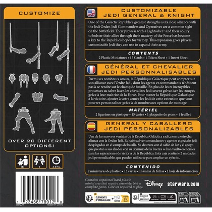 Dodatek Customizable Jedi General & Knight oferuje graczom możliwość stworzenia dwóch unikalnych postaci Jedi - Generała i Rycerza - które mogą pełnić rolę Dowódcy (Commander) lub Operacyjnej jednostki (Operative) w armiach Galactic Republic.   Co znajdziesz w zestawie? Ponad 20 opcjonalnych części, które pozwalają na personalizację figurek, dając ogromne możliwości dostosowania ich wyglądu do własnych preferencji. 11 unikalnych kart ulepszeń, które umożliwiają modyfikację zdolności Jedi oraz ich roli na polu bitwy. Gracze mogą nawet wybrać formę walki mieczem świetlnym, dostosowując swoją postać do idealnej pozycji w armii. Dodatek wprowadza pierwszych w pełni dostosowywalnych Jedi w grze Star Wars: Legion, oferując niezwykłe możliwości zarówno w kwestiach modelarskich, jak i strategicznych. To doskonałe rozszerzenie dla graczy korzystających z zestawu startowego Galactic Republic Starter Set, jak i wszystkich, którzy chcą dodać wyjątkowe postaci Jedi do swoich armii.