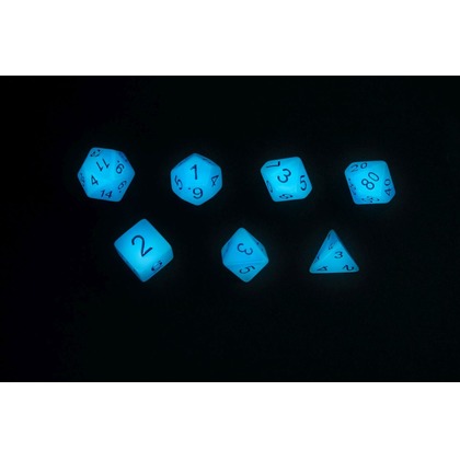 Glow Series - RPG Dice Set - Icy Crumbs to unikalny i przepięknie wykonany zestaw kości, który świeci w ciemności. Kolorystycznie zabiorą Cię one w podróż po lodowcach. Wykonane są z najwyższej jakości materiałów.   Zestaw zawiera kości: K4, K6. K8, K10, K00, K12, K20.