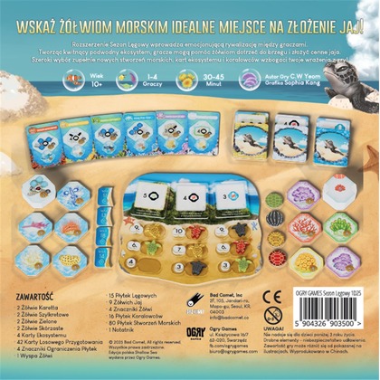 W pierwszym rozszerzeniu natura budzi się do życia jak nigdy dotąd! Sezon lęgowy wprowadza dodatkową planszę - Wyspę Żółwi unikalny obszar, do którego migrują morskie żółwie. Te majestatyczne stworzenia nie tylko wpływają na rozgrywkę, ale także oferują nowe możliwości punktacji i interakcji między graczami.