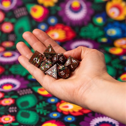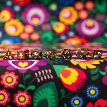 Kości Full Art: Krajka to ukłon w stronę słowiańskiego dziedzictwa i tradycyjnej sztuki rzemieślniczej. Inspiracją do stworzenia tego wyjątkowego zestawu była krajka zdobiony pas symbolizujący tożsamość, przynależność i ochronę. Na bordowym tle kostek widać misternie splecione motywy kwiatów i ptaków, które oddają ducha ludowej ornamentyki. Dlaczego warto? Dziedzictwo w nowoczesnej formie Inspirowane tradycyjnymi wzorami słowiańskiej krajki, w nowoczesnym wydaniu Full Art. Pełnokolorowy nadruk Szczegółowy i trwały wzór. Harmonia i estetyka Tradycyjne motywy kwiatowe i ptasie splatają się w doskonały, artystyczny wzór. Wyraźne cyfry runiczne Dzięki wysokiemu kontrastowi są przejrzyste i łatwe w odczytaniu. Hołd w stronę tradycji Zestaw dla kolekcjonerów, graczy i miłośników piękna, którzy cenią symboliczne znaczenie zaklęte w przedmiotach.