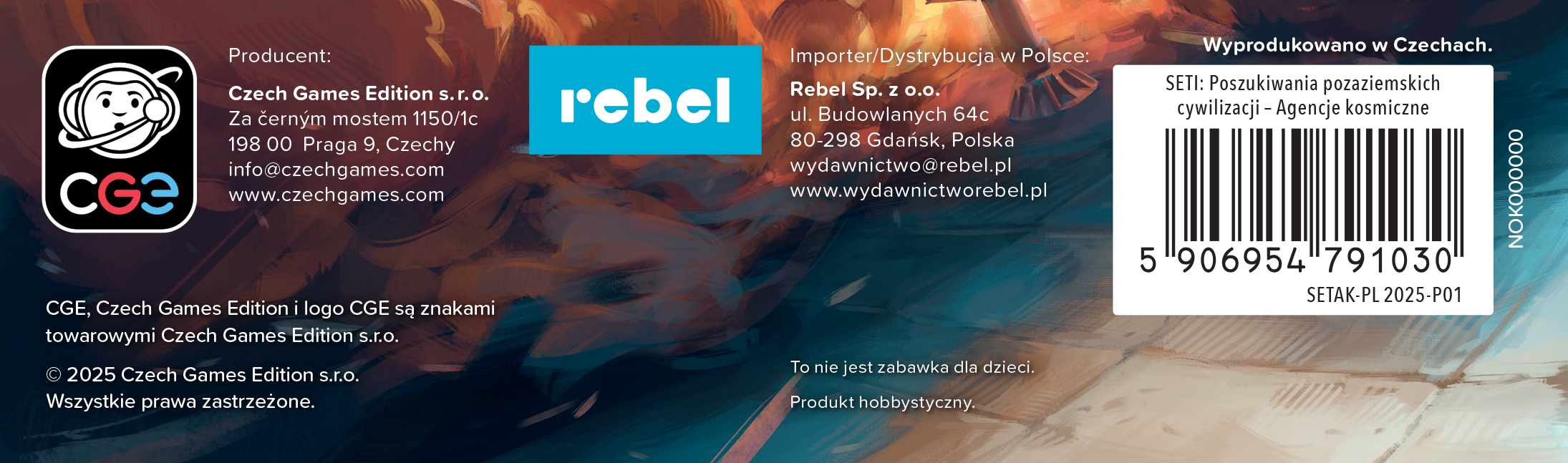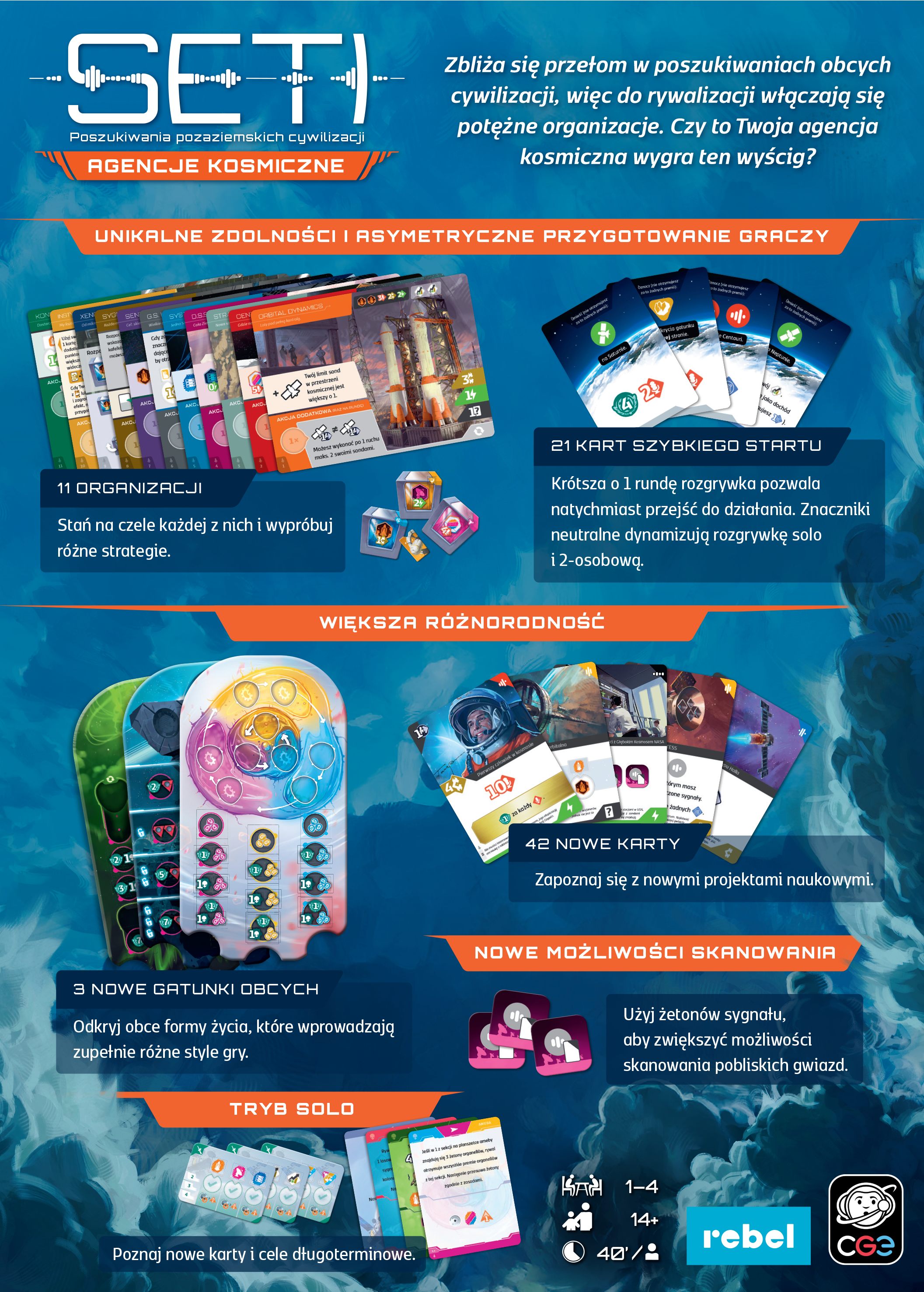 Poszukiwania pozaziemskich cywilizacji nabierają rozpędu. Wszystko wskazuje na to, że zbliża się przełom, więc do wyścigu włączają się potężne organizacje, różniące się pod względem wizji, metod i motywacji. Ich udział zmienia dalszy bieg badań. Czy to Twoja organizacja nawiąże kontakt z obcymi jako pierwsza?   SETI: Poszukiwania pozaziemskich cywilizacji - Agencje kosmiczne to rozszerzenie wprowadzające asymetryczne warunki początkowe od tej pory każdy z graczy będzie reprezentował inną firmę z własnym zestawem narzędzi i umiejętności, co pozwoli na wypróbowanie zupełnie nowych strategii. Oprócz tego w pudełku znajdziemy 3 nowe gatunki obcych z unikalnym zestawem zasad oraz ponad 40 nowych kart inspirowanych rzeczywistymi projektami naukowymi. W rozszerzeniu SETI: Poszukiwania pozaziemskich cywilizacji - Agencje kosmiczne wystąpił błąd w druku: dostępne w grze panele powinny mieć różne symbole na każdej ze stron, podczas gdy w niektórych przypadkach są one identyczne. W pudełku z dodatkiem znajdziesz zestaw naklejek, który pozwoli Ci samodzielnie to naprawić. UWAGA! Błąd występuje tylko w niektórych egzemplarzach, więc najpierw upewnij się, że Twoje panele wymagają użycia naklejki!   Czym jest SETI: Poszukiwania pozaziemskich cywilizacji?   To złożona gra ekspercka, w której wcielamy się w liderów eksploracji kosmosu i korzystamy z najnowocześniejszych technologii, by odwiedzać inne planety, badać odległe gwiazdy i rozwijać swoje możliwości. Oferuje ponad 200 unikalnych kart technologii opartych na rzeczywistej wiedzy naukowej oraz mnóstwo elementów, dzięki którym w każdej rozgrywce odkrywamy nowe możliwości i drogi do zwycięstwa.