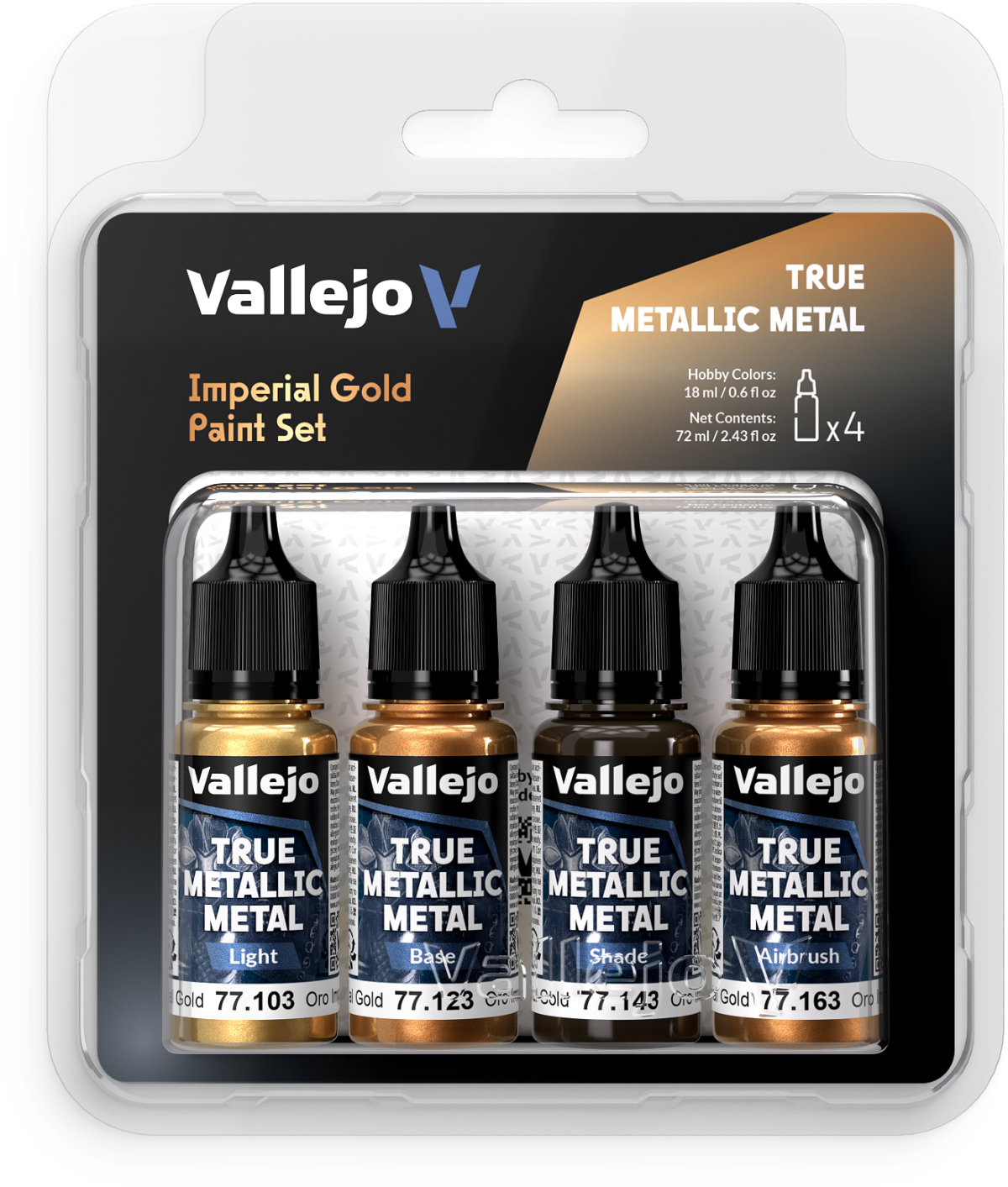 True Metallic Metal to farby z prawdziwymi metalicznymi pigmentami, które pozwalają oddać realistyczne metaliczne powierzchnie. Produkty z tej serii pozwalają na uzyskanie naturalnych odbić światła i spektakularnych efektów wizualnych, zachowując przy tym autentyczną "metaliczność" materiału w miniaturowej skali.   Zestaw zawiera kompatybilne kolorystycznie farby Imperial Gold w czterech rodzajach - Light, Base, Shade i Airbrush.
