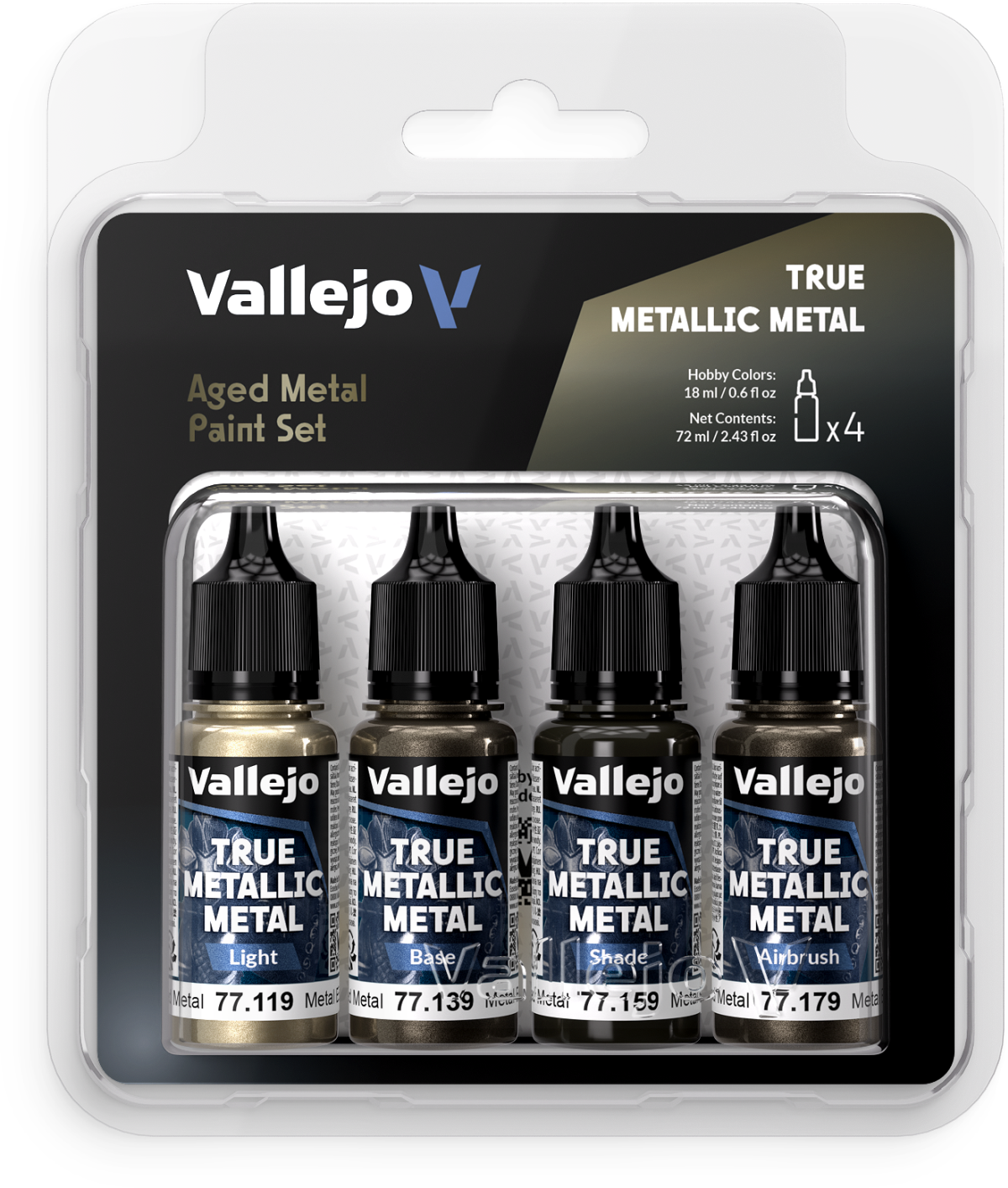 True Metallic Metal to farby z prawdziwymi metalicznymi pigmentami, które pozwalają oddać realistyczne metaliczne powierzchnie. Produkty z tej serii pozwalają na uzyskanie naturalnych odbić światła i spektakularnych efektów wizualnych, zachowując przy tym autentyczną "metaliczność" materiału w miniaturowej skali.   Zestaw zawiera kompatybilne kolorystycznie farby Aged Metal w czterech rodzajach - Light, Base, Shade i Airbrush.