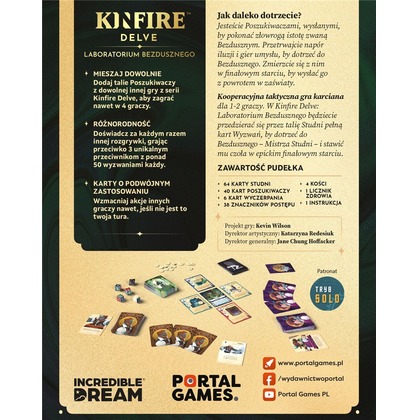 Wejdź do mrocznego Laboratorium, w którym drużyny poszukiwaczy zaginęły, a otaczający świat zaczyna obumierać. Czy stawisz czoła niezwykłym wyzwaniom i odnajdziesz klucz do zagadki? Kinfire Delve: Laboratorium Bezdusznego to wciągająca gra karciana zaprojektowana przez Kevina Wilsona, znanego z takich klasyków jak Arkham Horror czy Descent. Przygotuj się na zmienną, nieoczywistą rozgrywkę i ekscytującą kooperację!   Co znajdziesz w grze? Mieszane talie poszukiwaczy: możesz wykorzystać talie z innych gier serii Kinfire Delve, aby połączyć siły i grać nawet w 4 osoby. 3 unikalnych przeciwników: za każdym razem inny wróg i ponad 50 wyzwań na każdego z nich sprawiają, że każda rozgrywka jest unikalna. Karty o podwójnym zastosowaniu: wspieraj drużynę i realizuj swoje cele nawet wtedy, kiedy nie jest Twoja tura! To gra, w której decyzje liczą się na każdym kroku.   Dlaczego warto? Dynamiczna i niepowtarzalna rozgrywka, unikalne wyzwania i możliwość pełnej kooperacji - Kinfire Delve: Laboratorium Bezdusznego to idealny wybór dla miłośników gier przesyconych klimatem pełnym tajemnic, przygód i trudnych decyzji.