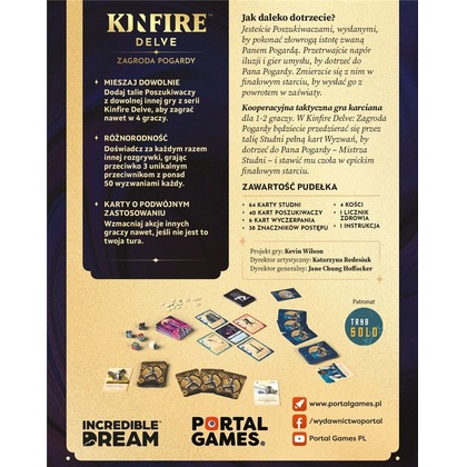 Doświadcz przerażających wyzwań w mrocznej Zagrodzie Pogardy, gdzie obsesyjna sprawiedliwość Pana Pogardy zmieniła to miejsce w wynaturzone więzienie. Czy odnajdziesz sposób, by stawić mu czoła i uwolnić uwięzionych?   Co znajdziesz w grze? Elastyczną rozgrywka dla 1-4 graczy: połącz talie Poszukiwaczy z innych gier serii Kinfire Delve, by stworzyć unikalną drużynę. 3 przerażających przeciwników: każdy z ponad 50 wyzwaniami, co zapewnia różnorodność i zmienność każdej kolejnej partii. Karty o podwójnym zastosowaniu: dzięki tej mechanice możesz wspierać swoich towarzyszy w każdej chwili, nawet kiedy nie jest Twoja tura. Znane nazwisko projektanta: gra zaprojektowana przez Kevina Wilsona, mistrza gier takich jak Arkham Horror, Descent czy Gra o Tron.   Dlaczego warto? Zagroda Pogardy to nie tylko gra, ale też wciągające wyzwanie, które dzięki różnorodnym mechanikom i fabule angażuje na każdym kroku. Możesz grać zarówno solo, jak i w drużynie, odkrywając tajemnice Pana Pogardy i jego więzienia.