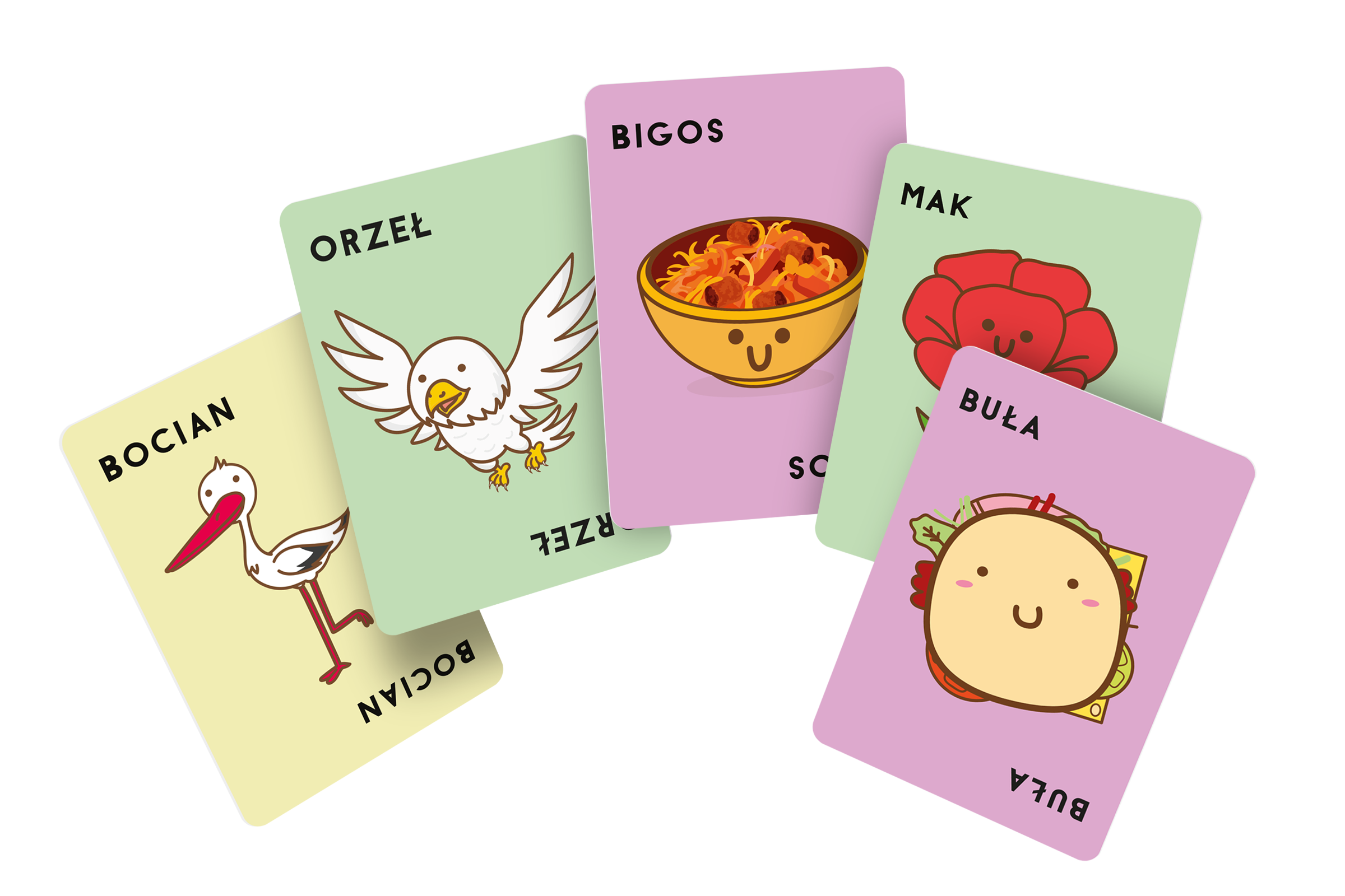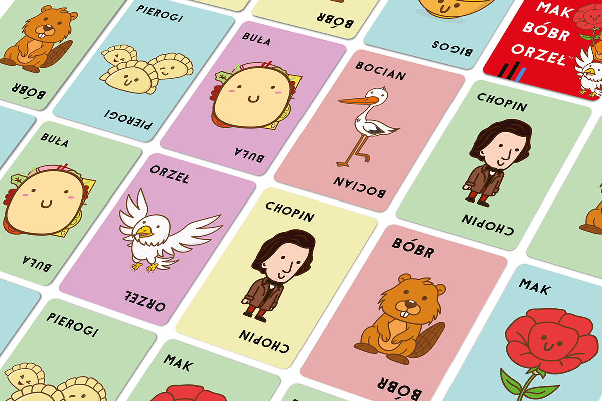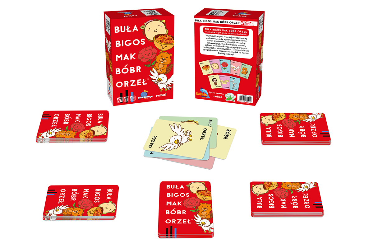 Buła, Bigos, Mak, Bóbr, Orzeł! Wykładaj karty w rytm tej niezwykle polskiej wyliczanki, a gdy wypowiedziane słowo pasuje do obrazka, klepnij kartę ręką, nakrywając ją. Ten, kto będzie ostatni, zabiera wyłożone karty, a zwycięży gracz, który pozbył się wszystkich. Zabawa będzie szalona niczym tytuł gry, ale możemy zagwarantować, że dostarczy równie dużo radości, co jedzenie pierogów i słuchanie muzyki Chopina! Na czym to polega? Każdy z graczy otrzymuje talię złożoną z identycznej liczby kart, których nie wolno im podglądać. Pierwsza osoba wykłada odkrytą kartę na środek, mówiąc buła. Gracz po jej lewej kładzie swoją odkrytą kartę na poprzednią, mówiąc bigos. Wymienianie w kółko kolejnych słów z tytułu trwa dopóki karta, która właśnie została wyłożona, nie będzie pasował do wypowiadanego przez gracza słowa (np. wyłoży bobra, mówiąc bóbr). W tym momencie wszyscy muszą jak najszybciej położyć swoje dłonie na środkowym stosie kart, a ostatni gracz, który to zrobi, bierze cały stos do siebie i dodaje do już posiadanych kart. Celem jest pozbycie się wszystkich swoich kart zwycięży ten, kto tego dokona, a następnie jako pierwszy położy rękę na stosie przy najbliższym dopasowaniu. Opanowane? To świetnie, bo czekają na Was jeszcze karty z bocianem, pierogami i Chopinem, które tylko czekają, żeby zburzyć Wasz rytm gry! Gdy pojawią się na stole, musicie jak najszybciej wykonać przypisane do nich gesty. Dlaczego pokochasz tę grę? Szybka, zabawna, szalona taka właśnie jest ta karcianka. Przy stole czeka nas wiele emocji, presja będzie rosła wraz z tempem wykładania kart, a ten, kto poczuje się zbyt pewnie, może szybko stracić wypracowaną w pocie czoła przewagę. Buła, Bigos, Mak, Bóbr, Orzeł to gra na wskroś polska, a jednocześnie równie uniwersalna, jak poprzednie odsłony serii. Malutka, dzięki czemu nadaje się do zabrania w absolutnie każdą podróż. Prosta, więc nie wymaga długiego tłumaczenia zasad. Jakby tego było mało, do zabawy nie potrzebujemy wiele miejsca wystarczy kawałek płaskiej powierzchni, który możemy wspólnie otoczyć. Oprócz treningu spostrzegawczości i refleksu, gra oferuje też dodatkowe utrudnienia w postaci kart specjalnych, które zmuszają nas do wykonywania przypisanych do nich gestów. Jeszcze więcej śmiechu i zabawy (i okazji do pomyłek, czyli śmiechu i zabawy kosztem innych #najlepiej)!