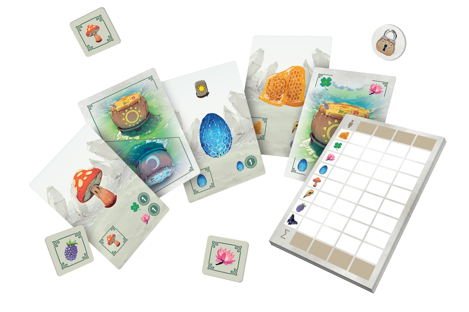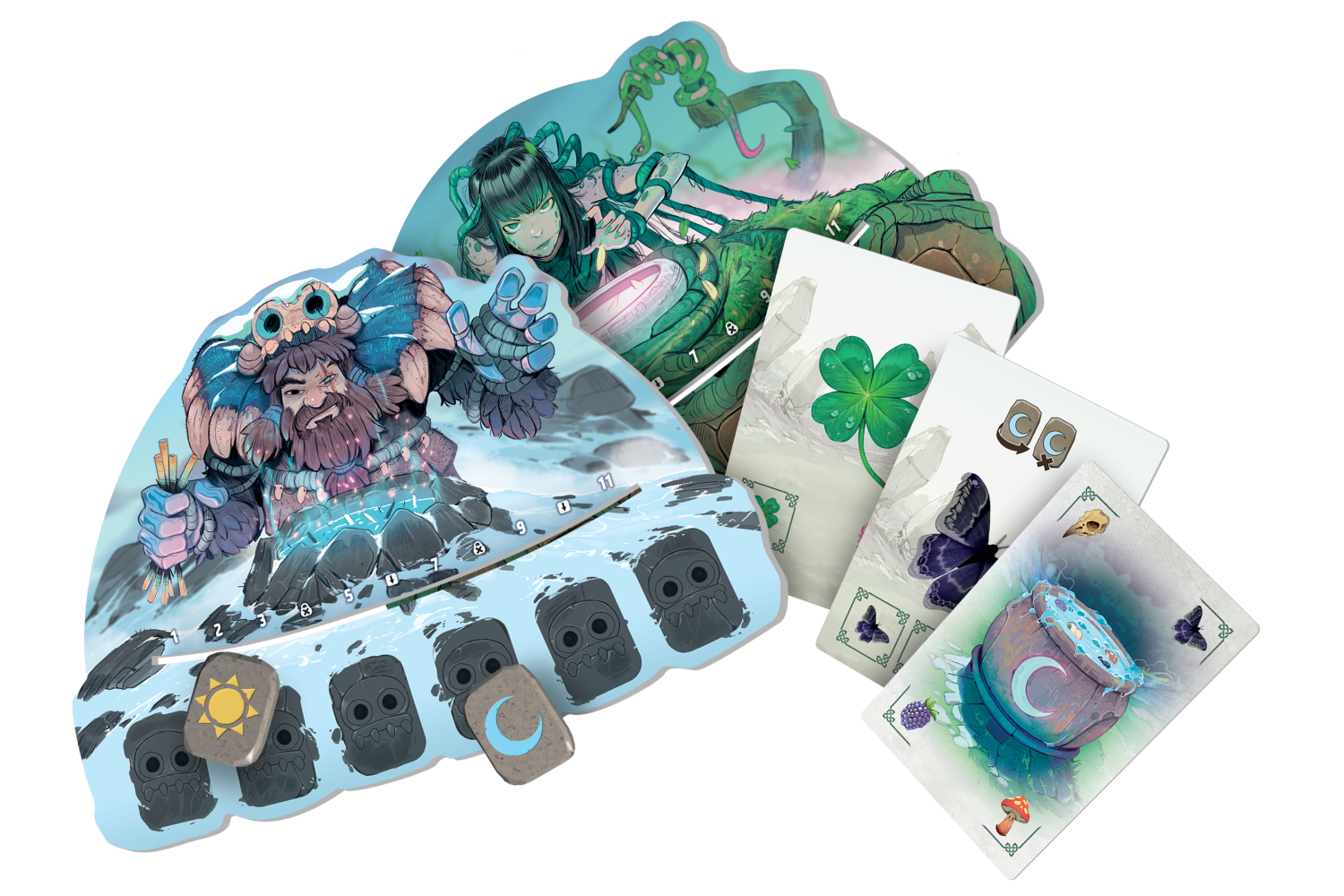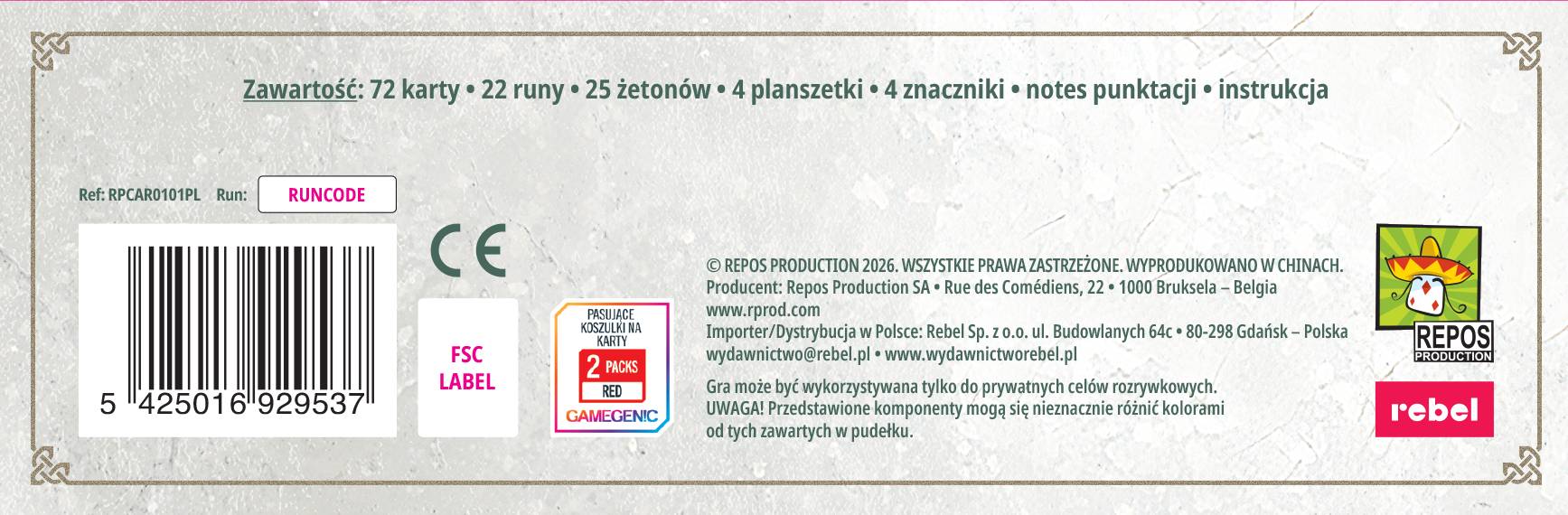 Dziękujemy wszystkim za przybycie z odległych krain. Zgodnie z tradycją organizujemy zawody warzenia mikstur, które pozwolą wyłonić druida roku. Chwyćcie za sierpy, rozpalcie ogień pod kociołkami... Turniej czas zacząć! Karnuta to strategiczna gra, w której staramy się uwarzyć eliksir poprzez zagrywanie kart przed sobą. Uważnie wybieraj składniki, tak aby razem dały jak najlepszy efekt i sprytnie wykorzystuj symbole słońca i księżyca, by uwarzyć miksturę, która zapewni Ci jak najwięcej punktów! Na czym to polega? Celem gry jest uwarzenie mikstury poprzez zagrywanie kart przed sobą. Wartość każdej karty zależy od znajdujących się na niej składników. Podczas zabawy rozgrywamy kolejno swoje tury. W swojej turze wykonujemy 2 akcje (takie same albo różne) spośród 4 dostępnych. Do wyboru mamy wzięcie karty, zagranie karty, wzięcie runy lub odwrócenie runy. Karty dobieramy z puli 8 odkrytych na stole i najpierw umieszczamy je na ręce. Aby zagrać kartę z ręki, musimy opłacić jej koszt runami ze swojej planszetki. Czasem będziemy musieli odrzucić runę, innym razem tylko odwrócić ją na drugą stronę. Każda z run po jednej stronie ma symbol słońca, a po drugiej księżyca. Są one związane z dwoma rodzajami kart (i składników) występujących w grze: dziennymi oraz nocnymi. Co ważne, zarówno przy dobieraniu, jak i odwracaniu run musimy wybrać jeden ich rodzaj, co mocno wpływa na nasze zarządzanie tym cennym zasobem. Rozgrywka dobiega końca, gdy dowolny gracz zagra 11. kartę, po czym następuje podliczanie punktów. Niektóre karty mają po prostu własną wartość punktową, ale znaczna część punktuje za zgromadzone inne składniki lub zestawy składników. Kluczem do zwycięstwa jest więc takie dobieranie kolejnych kart, by jak najściślej się ze sobą wiązały. Zwycięży osoba, której mikstura zapewni najwięcej punktów! Dlaczego pokochasz tę grę? Podstawowy mechanizm gry jest bardzo prosty, dzięki czemu z łatwością zaprosimy do stołu nowe osoby. Do wykorzystania mamy jeden zasób w postaci dwustronnych żetonów run. Zarządzanie runami będzie kluczowe dla zdobywania upatrzonych kart. Całe piękno Karnuty polega na strategicznych możliwościach, jakie daje łączenie ze sobą odpowiednich składników. Niektóre karty punktują za konkretne zestawy, a naszym zadaniem jest stworzenie jak najlepiej działających zależności w puli ograniczonej do maksymalnie 11 kart. Tytuł gry nawiązuje do prawdziwych wydarzeń! W czasach starożytnych druidzi rzeczywiście gromadzili się co roku w lesie nieopodal dzisiejszego Chartres. Tereny te zamieszkiwało plemię Karnutów, żyjące w Galii jeszcze przed najazdem Rzymian.