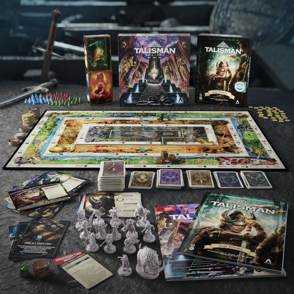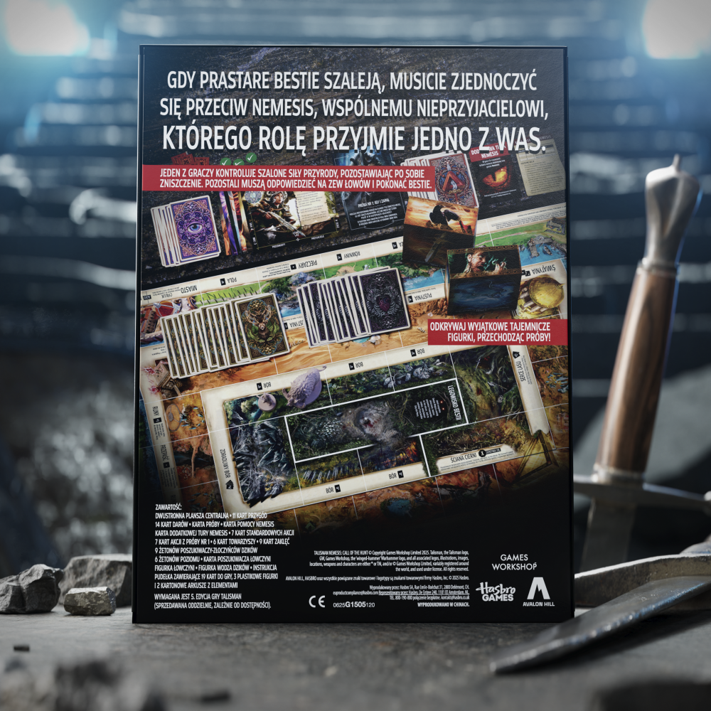 Nemesis dowodzi rozwścieczonymi bestiami, które zostawiają po sobie ścieżkę zniszczenia, a bohaterowie muszą odpowiedzieć na wezwanie polowania i powstrzymać te bestie! Przygotuj się na asymetryczną rozgrywkę 1-na-wielu (mechanika 1-vs-many) w dodatku Talisman: Magia i Miecz - Nemesis - Zew łowów!   Gracze-bohaterowie muszą współpracować, by przetrwać 3 niebezpieczne Próby, z których każda ma własnego przeciwnika i złoczyńców. Aby wygrać, muszą pokonać każdego przeciwnika, zanim gracz-Nemesis ich wyeliminuje. Cel Nemesis? Każda Próba przynosi nowy. W miarę postępów gracze będą otwierać pudełka i odkrywać tajemnicze karty oraz figurki, które dodadzą do gry.   Talisman: Magia i Miecz - Nemesis - Zew łowów rozszerza grę podstawową o nowe stwory, fabułę, komponenty oraz mechanikę 1-vs-many, gdzie jeden gracz wciela się w rolę czarnego charakteru, kontroluje przeciwników i złoczyńców przez całą rozgrywkę, a pozostali gracze są bohaterami współpracującymi, by pokonać zło.   Aby wygrać, trzeba zaliczyć pozytywnie 3 Próby - niebezpieczne wyzwania wymagające strategii i odrobiny szczęścia. Każda z nich ma swoje cele dla każdej z ról oraz unikalnego przeciwnika do pokonania.